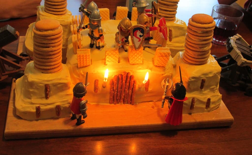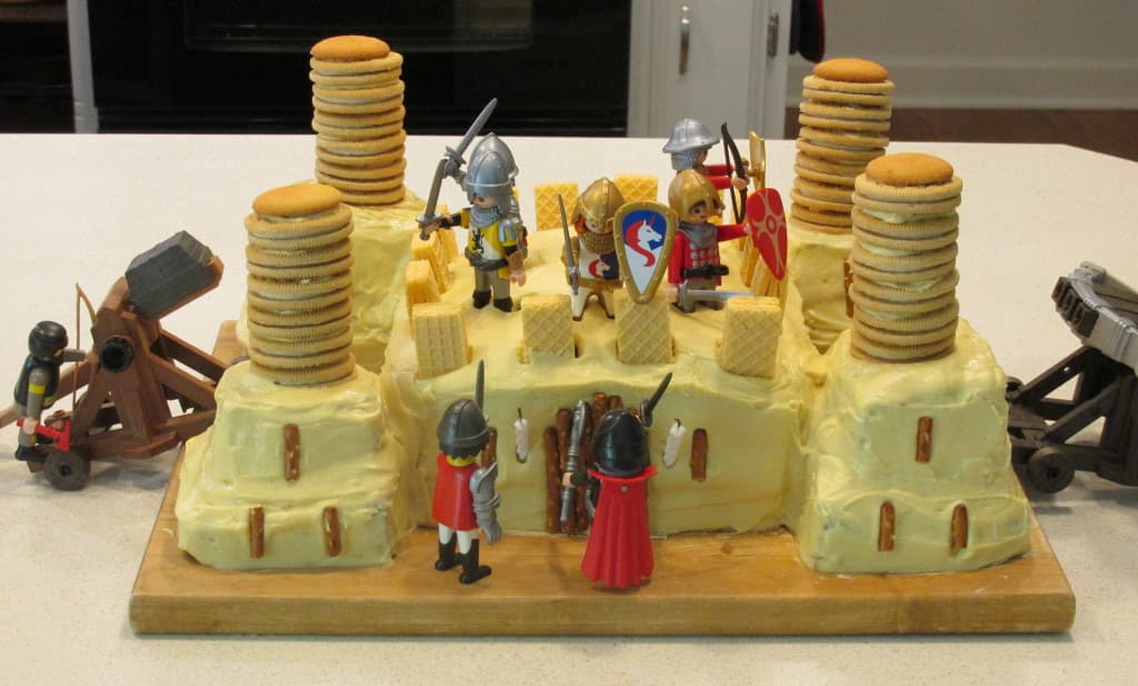 Cake seems like a good way to restart the Starlighting Mama blog for the season. The blog and I take summers off from each other. In summer, the outdoors is calling, the children are calling, and computers are cool, but not all the time. So here we are back again, and I can’t resist sharing with you my newest cake creation, created for my son’s birthday: A Besieged Castle.